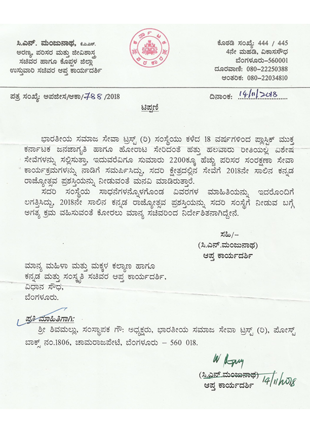 Ministor of Environment, Government of Karnataka in recognition of our Plastic Free Karnataka Achievement