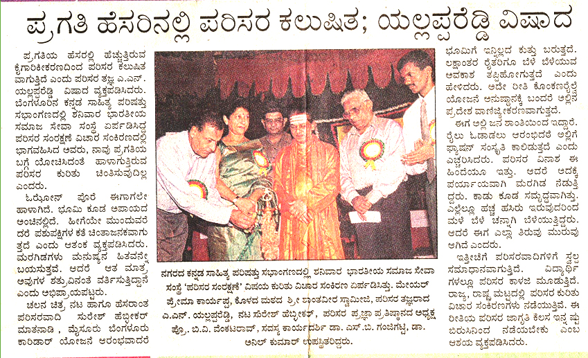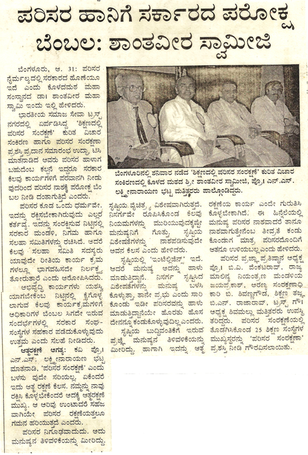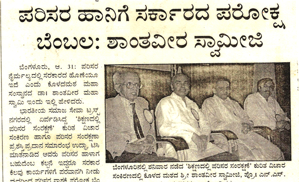 From left : Dr. Anilkumar, President, Indian Medical Association, Bangalore Brnach, Environmentalis Suresh Heblikar, Dr. SB Ganjigatti, Member Secretary, Karnataka State Pollution Control Board, Govt. of Karnataka, Hon’ble Mayor Bangalore Smt. Prema Kariyappa, Hon’ble Mayor, Seer Sri. Sri. Sri. Dr. Shanthaveera Swamiji, Ecologists Dr. AN Yellappa Reddy, Former Secretary, Environment and Ecology, Government of Karnataka, Prof. BV Venkata Rao, President, Environment Education Foundation, Environmentalist Shivamallu and others were present.