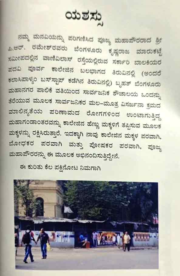 - 6. Action initiated by BBMP towards construction of public urinals near Kalasipalyam by the side of Vani Vilas Pre-University College Compound Wall.